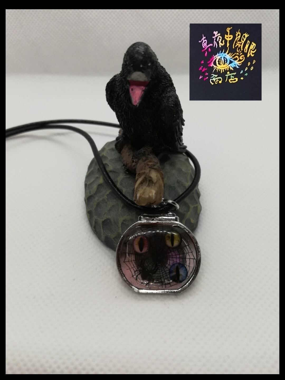 蜘蛛の巣に邪眼をあしらい、裏側ににも大きめの邪眼を封入しています。透かした際にまた違った様子をお楽しみいただけます。