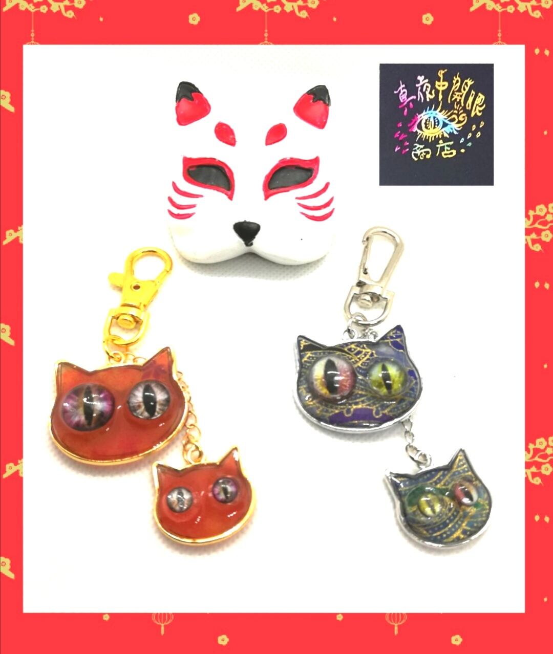 和柄模様の大小、オッドアイの猫をモチーフにしたキーホルダーです。